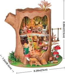 Vstopite v svet domišljije in ustvarite svojo Gozdno hiško iz štorov – dvonadstropno mini hiško z lesenim pohištvom, kuhinjo, spalnico, dekoracijami, gobarskim vrtičkom in zunanjo gugalnico. Po vklopu LED lučk se model spremeni v očarljivo postavitev in postane središče pozornosti vsake police.