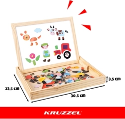 Kreativna dvostranska tabla KRUZZEL za otroke od 3 let združuje belo magnetno površino za sestavljanje oblik in pisanje s flomastrom s črno kredno stranjo za risanje. V kompletu je 108 barvnih magnetnih delov, suhi flomaster, krede, gobica in praktična lesena škatlica za shranjevanje. Odlična pripomoček za razvoj fine motorike, logičnega razmišljanja in ustvarjalnosti brez zaslonov.