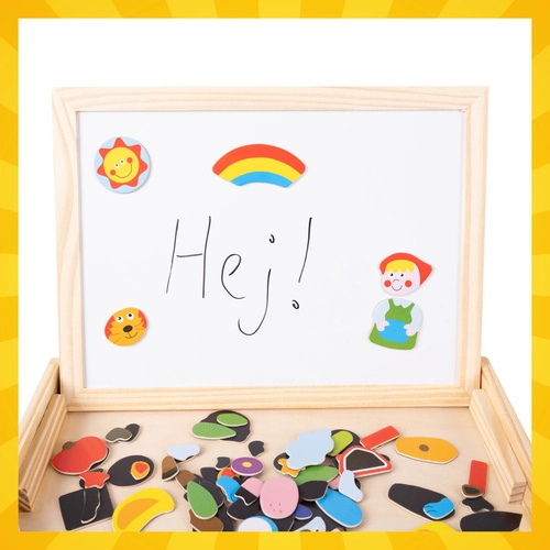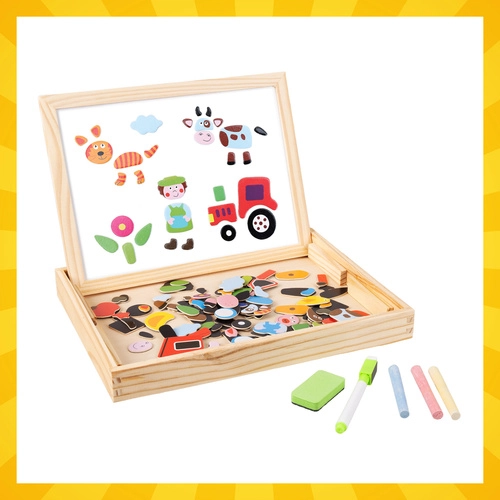 Odkrijte pametno igračo, ki raste z vašim otrokom. Dvostranska tabla ponuja dva svetova zabave – bela magnetna stran za sestavljanje živalic, figuric in vozil ter pisanje s suhim flomastrom, in črna kredna površina za prosto risanje. Vse je shranjeno v kompaktni leseni škatlici, ki služi tudi kot stojalo.