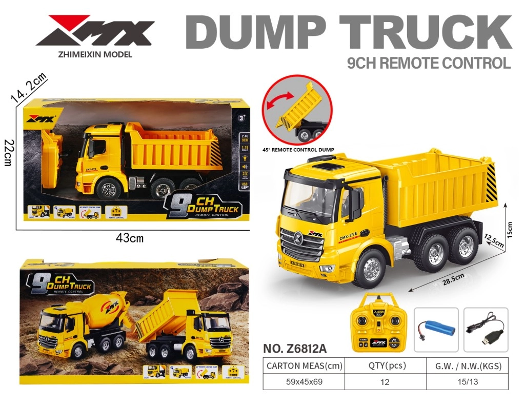 Uživajte v realistični vožnji z rumenim RC prekucnikom, ki zvesto posnema gradbeno vozilo. Podrobno oblikovana kabina, tri osi in izrazite pnevmatike poudarjajo njegovo vzdržljivo konstrukcijo, medtem ko se keson dvigne do kota 45°, zato zlahka simulira pravo raztovarjanje tovora.