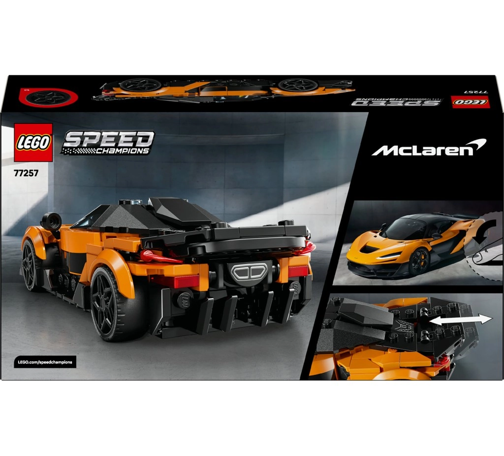 Uživajte v kombinaciji realističnega dizajna in napete igre s kompletom LEGO Speed Champions McLaren W1. Oranžno‑črna barvna shema, nizkoprofilne pnevmatike in podrobna karoserija očarajo na prvi pogled – ne glede na to, ali model razstavite ali se podate na domišljijsko dirkalno stezo. Z aplikacijo LEGO Builder lahko model približujete in obračate v 3D ter sledite jasnim navodilom korak za korakom.