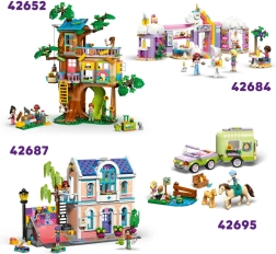 V kompletu so minifigurice Liann, Aliya in inštruktorica Cindy, konja Coco in Thunder, dve mački in majhen pes. Ne manjkajo dodatki, kot so samokolnica za seno, škatle za krmo, ovire, pokali in tabla z lekcijami, ki spodbujajo odprto ustvarjalno igro.