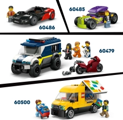Model v rdeči in črni barvi dopolnjuje črno‑beli karo vzorec na straneh ter funkcionalni elementi za interaktivno igro: odstranljiv kiosk za lahek dostop v notranjost, drsno okence za izdajo in pokrov z motorjem za dodaten detajl. Ne manjkata 2 minifigurici – prodajalec s kapo in stranka – pripravljena na neskončno mero zabave.