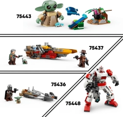 Zgradite napeto sceno iz obleganja Mandalora. Robustnega, kompaktnega pajka v rdeče‑črni kombinaciji z stud izstreljevalnikom in prozornim ščitom dopolnjuje barikada z vrtljivim stolpom za obrambo. Štiri podrobno potiskane minifigurice z blasterji, dolgimi puškami in reaktivnimi nahrbtniki vabijo k neskončni igri in razstavljanju.