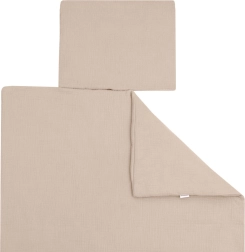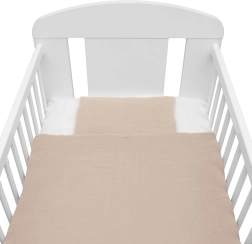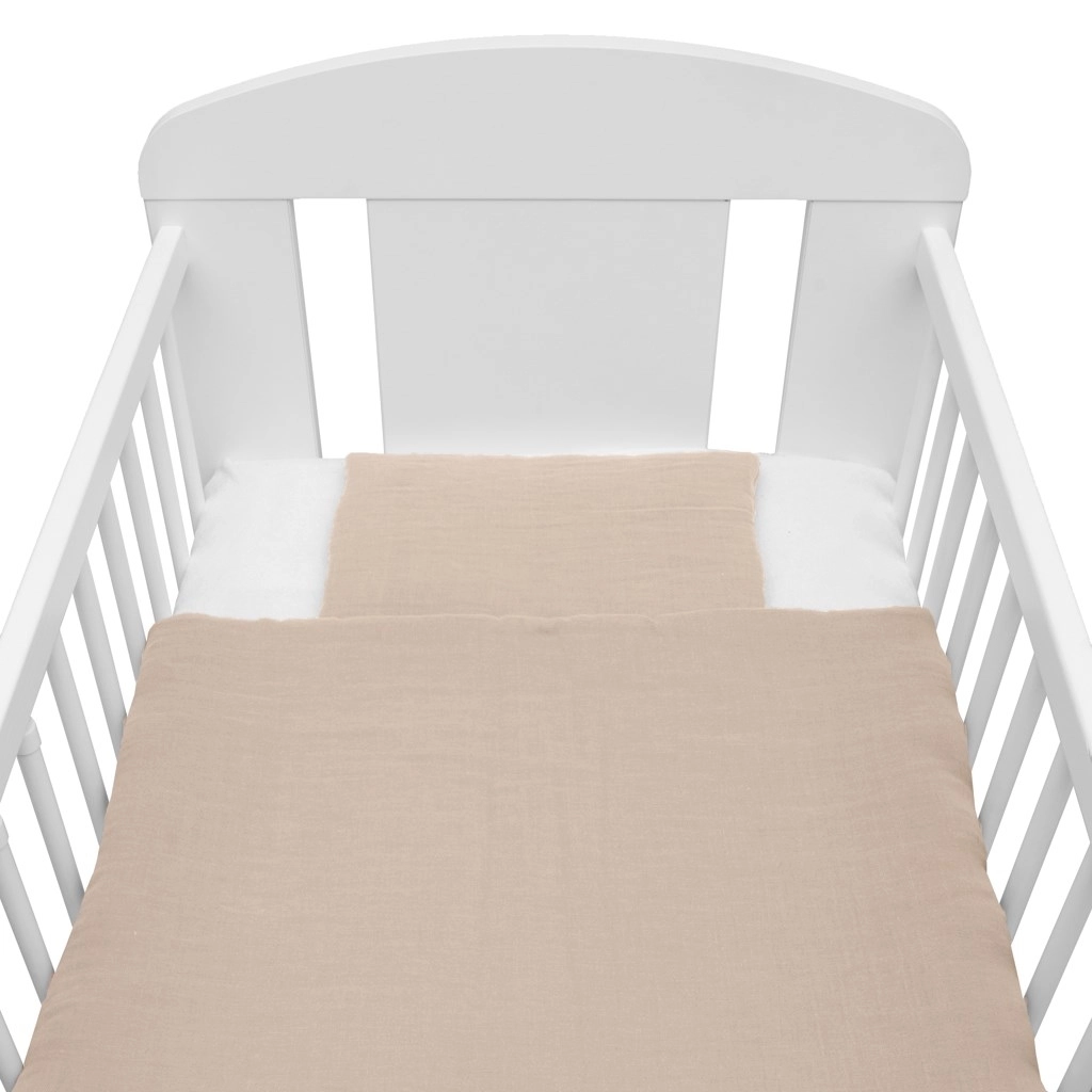 Ta bež muslinast komplet dojenčku nudi udobje od prvih dni življenja. Lahka in zračna struktura muslina zagotavlja odlično kroženje zraka ter zmanjšuje tveganje pregrevanja. Polnilo iz anti-alergijskih vlaken je varno in primerno tudi za občutljive otroke.