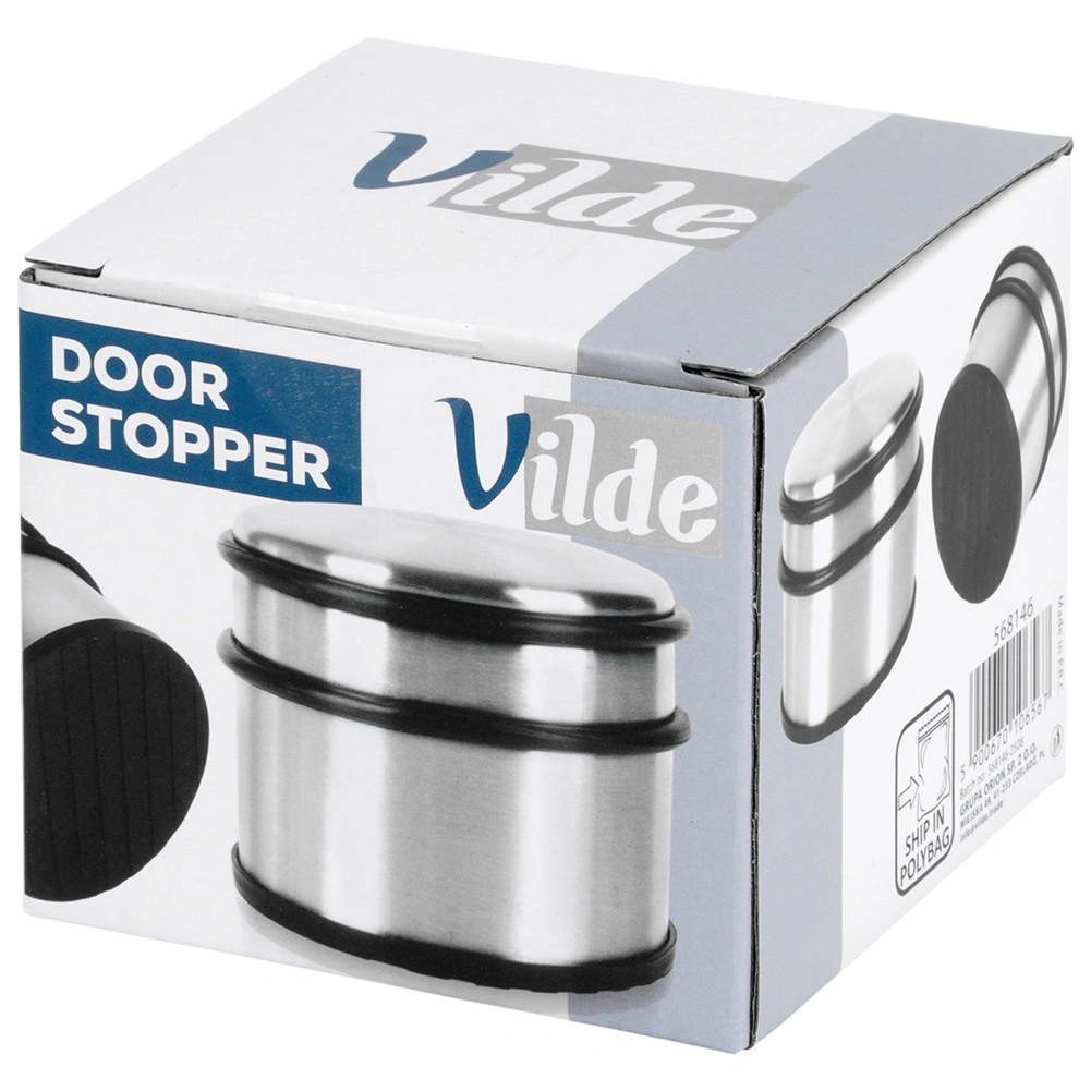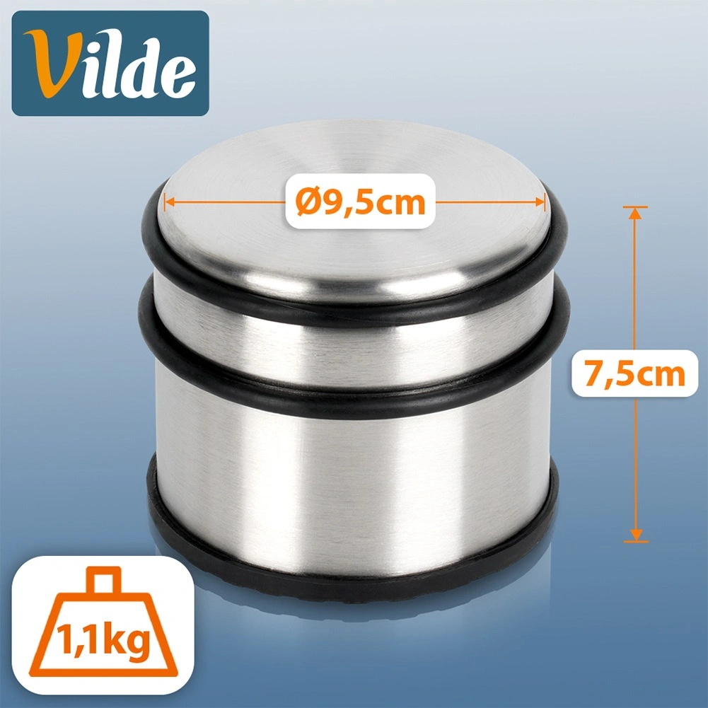 Robusten nerjavni stoper za vrata s težo 1,1 kg zanesljivo drži vrata na mestu ter ščiti stene in tla. Zaradi kompaktnih mer 9,5 × 7,5 cm in modernega videza se prilega vsakemu interierju. Protizdrsno gumijasto dno in gumijasti odbijači ublažijo udarce in preprečujejo praskanje. Brez vrtanja in lepljenja – dovolj je, da ga postavite na tla.