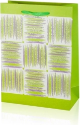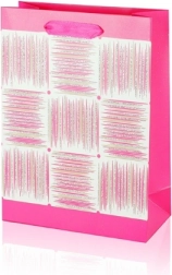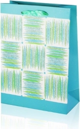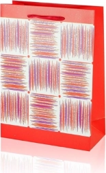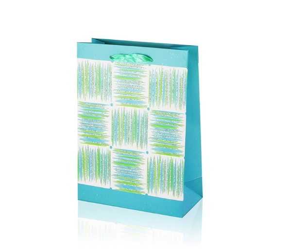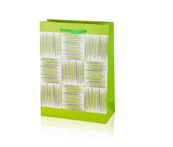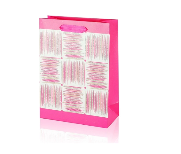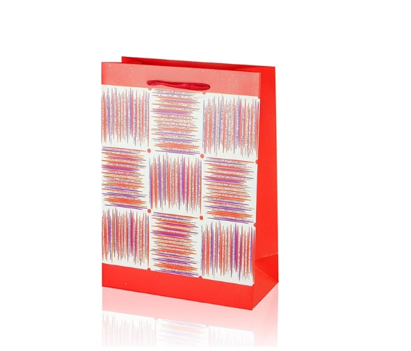 Ta darilna vrečka A5 združuje praktične mere z privlačnim dizajnom. Bleščeča površina, dekorativna plošča s črtami in trakasti ročaji vašemu darilu dodajo premium videz. Vrečka ima zložljive bokove in trdno dno za stabilnost pri vstavljanju predmetov.