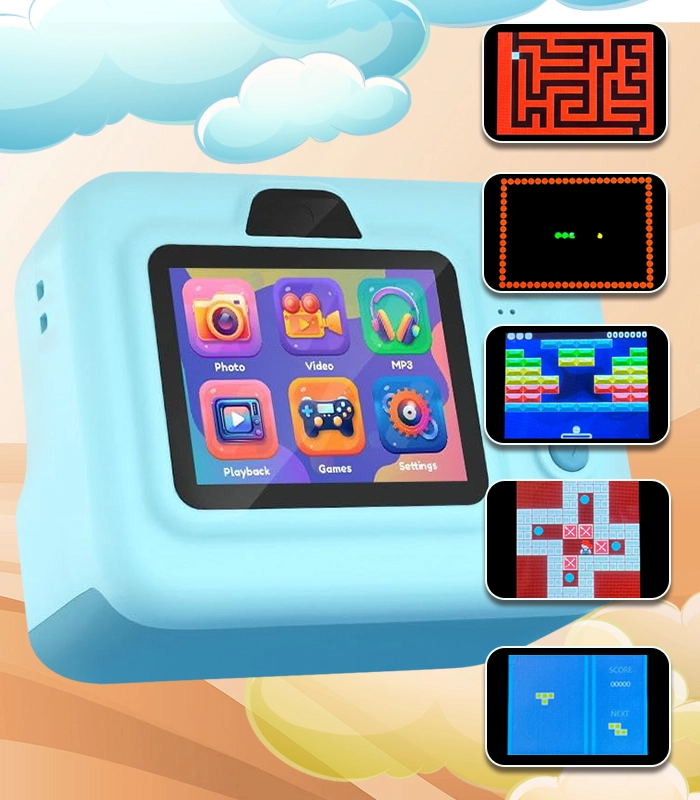 Fotoaparat združuje fotografiranje, video v 1080P in mini igre (uganke, kača, pinball, sokoban) za zabavo in razvoj ustvarjalnosti. Svetel 2,4" zaslon in intuitivno upravljanje otrokom olajšata pregledovanje ter delo s fotografijami in videi. Podpora pomnilniškim karticam microSD do 32 GB nudi dovolj prostora za spomine.