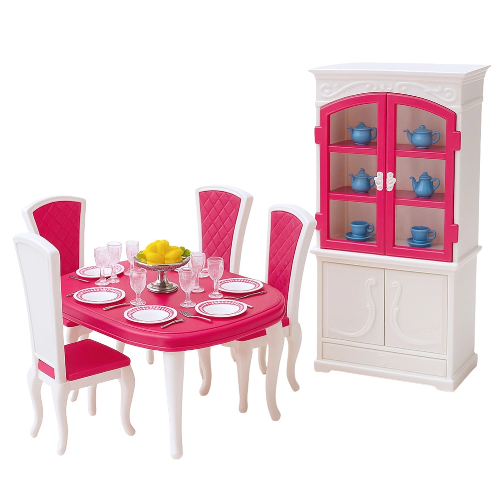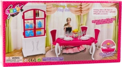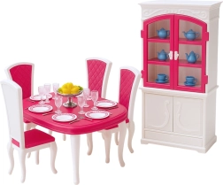 Ustvarite za svoje punčke prijeten prostor za skupne obroke in slavnostne pogostitve. Središče seta je prostorna miza s stoli, dopolnjena s kredenco z odpirajočimi se vratci za shranjevanje posodja. Bogata oprema krožnikov, skodelic, jedilnega pribora in dekoracij omogoča otrokom izmišljati nešteto scenarijev in razvijati domišljijo.