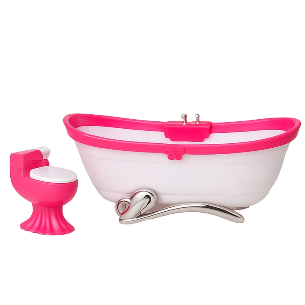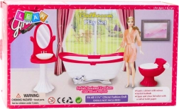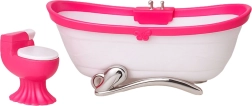 Stilski kopalniški komplet za punčke višine približno 29 cm prinaša realistično igro vsakodnevnih dejavnosti. Vsebuje banjo, stranišče z odpiralnim pokrovom in umivalnik z ogledalom. Lahka in trpežna plastična konstrukcija, rožnato-bela barvna kombinacija in dodelani detajli odlično dopolnijo hiško za punčke ali samostojno tematsko igro.