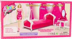 Stajliš komplet pohištva za spalnico za modno punčko višine približno 29 cm. Vsebuje posteljo, toaletno mizico z ogledalom in stolček. Trpežna plastična izvedba, rožnato-bela zasnova in varne zaobljene oblike spodbujajo kreativno igro in razvoj fine motorike.