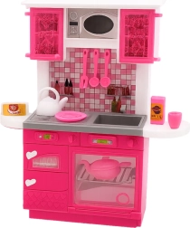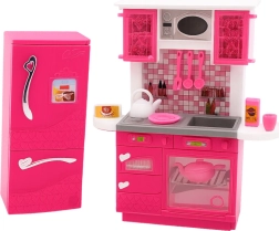 Ta podrobno izdelan komplet kuhinjske linije in samostojnega hladilnika v moderni rožnato-beli kombinaciji spremeni sobo v majhen kulinarični studio. Realistični elementi, kot so odpirajoča se pečica, pomivalno korito, zgornje omarice in police, vabijo k domiselnemu kuhanju in postrežbi. Priložena so tudi miniaturna posoda in živila, da je igra še bolj pestra.