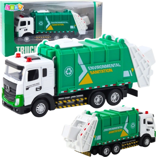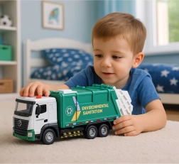 Realistični smetarski tovornjak bo navdušil male ljubitelje tehnike in komunalnih storitev. Ima trpežno kovinsko kabino, odpirajoča se vrata in dvižni koš kot prava smetarska oprema. Za zabavo poskrbijo svetlobni in zvočni učinki, ki so pripravljeni za uporabo zahvaljujoč bateriji AG13 v paketu.