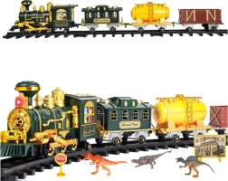 - lokomotiva, potniški vagon, cisterna, tovorni vagon, ravni tiri, ukrivljeni tiri, RC upravljalnik 27 MHz, figurice dinozavrov, prometne oznake, nalepke, drevesca
