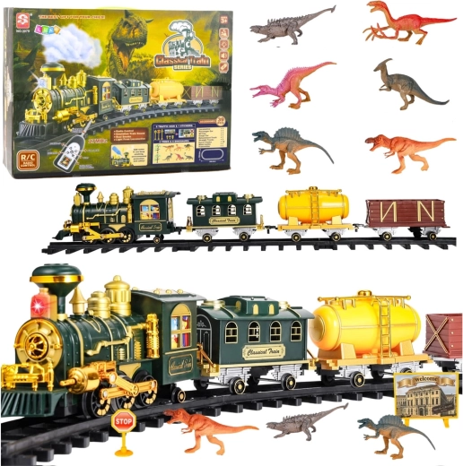 Odkrijte privlačno vlakovno progo, ki združuje čar parnih lokomotiv z avanturo prazgodovinskega sveta. Lokomotiva po dolivanju vode ustvarja realističen dim, ne manjkajo svetlobni učinki in zvoki pravega vlaka. Z RC upravljalnikom 27 MHz zlahka nadzirate smer in hitrost. Del kompleta je bogata scena z dinozavri, drevesi, oznakami in tematskimi dodatki za ustvarjalno igro.