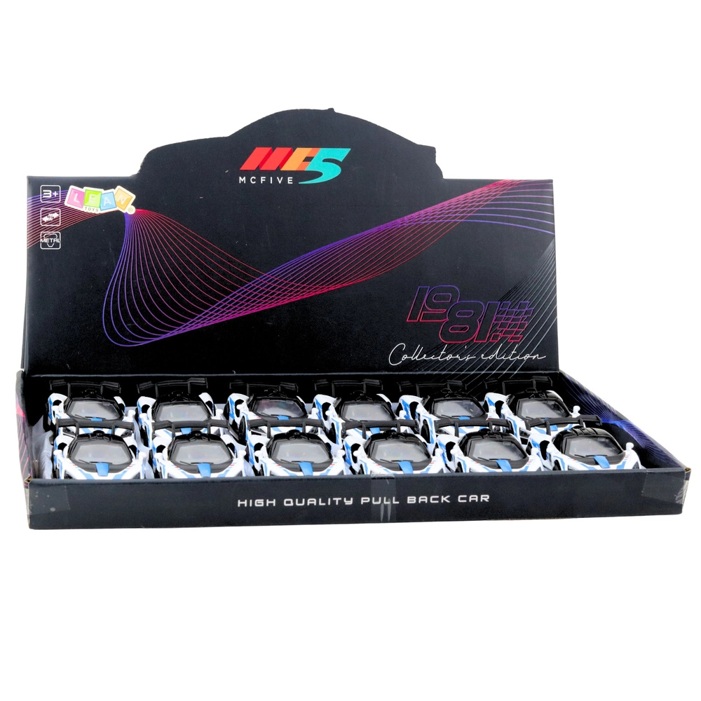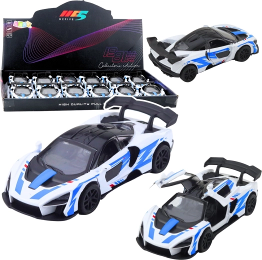 Avtomobilček je idealen za zabavo in zbiranje. Športen videz, aerodinamične linije in kontrastna barvna izvedba v beli z modrimi in črnimi elementi pritegnejo pozornost na prvi pogled. Kompaktne mere omogočajo, da igračo vzamete s seboj kamor koli – na sprehod, v vrtec ali na potovanja.