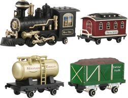 Ta električna vlakovna proga v klasičnem parnem dizajnu bo navdušila male in velike ljubitelje železnice. Lokomotiva po dodajanju vode ustvarja realističen dim, dopolnjen z lučmi in zvoki, zaradi česar vožnja deluje kot na resničnih tirih. RC upravljanje 2,4 GHz zagotavlja stabilen signal in gladko vodenje z izbiro smeri ter uravnavanjem hitrosti.