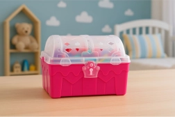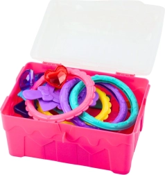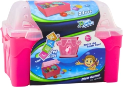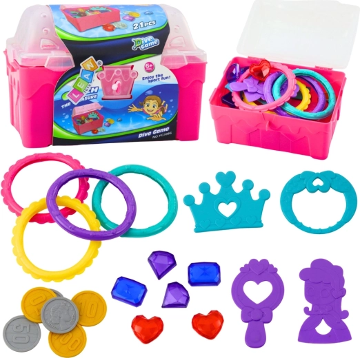 Odkrijte čar vodnih pustolovščin s kompletom zakladov za vodo. Rožnata skrinjica skriva plastične kovance, nakit, kronice in dragulje, ki jih lahko otroci skrivajo in pobirajo. Deli so lahki, izrazito barviti in jih je v vodi enostavno ujeti.