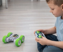 Upravljanje z RC upravljalnikom razvija koordinacijo, reflekse in natančnost gibov. Avto zmore vožnjo naprej/nazaj, levo/desno, polne 360° obrate in obrnjeno vožnjo po obeh straneh karoserije – idealno za akrobacije brez postanka.