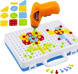 Ta izobraževalna sestavljanka na zabaven način podpira učenje in razvoj spretnosti. Otroci sami oblikujejo in sestavljajo vzorce na montažni plošči, privijajo barvne koščke in urijo natančnost gibov. Varen plastični vrtalnik na 2× AA bateriji in dodatna orodja zagotavljajo realističen doživljaj malega mojstra.