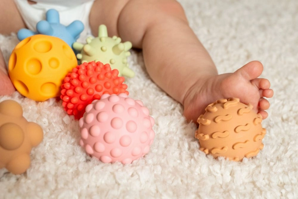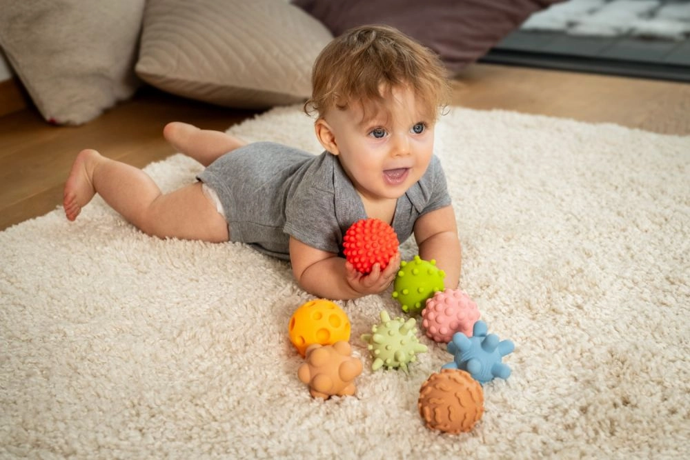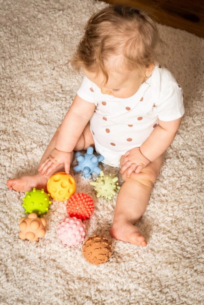Vsaka žogica ima edinstveno površino z izboklinami, čepki ali žlebovi, ki spodbujajo tipno zaznavanje in naravno radovednost otroka.