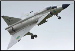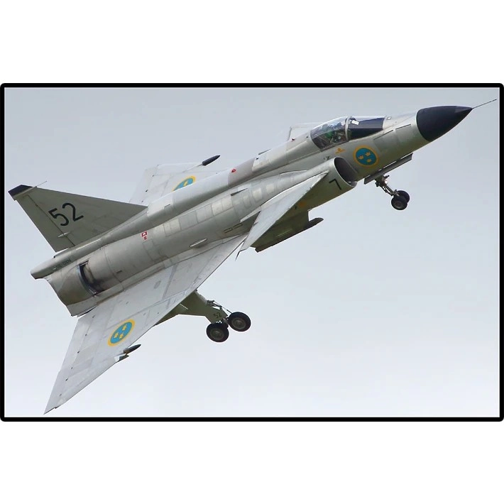 Natančno oblikovana delta krila, kanardne površine in podkrilno orožje dopolnjujejo trpežni potiski švedskega letalstva – brez uporabe nalepk.