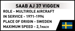 Vdihnite življenje legendi hladne vojne. Gradbeni komplet zvesto ujame značilno »kanardno« zasnovo in delta krila letala SAAB JA 37 VIGGEN, vključno s podkrilnim orožjem in podrobno izdelano kabino. Trpežni nadruki brez nalepk z oznakami švedskega letalstva dajejo modelu avtentičen videz, ki izstopa v vsaki zbirki.
