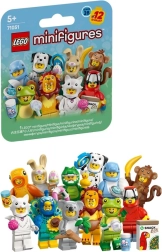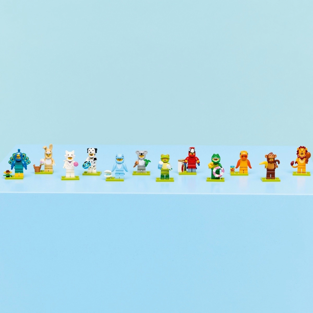 V seriji najdete like v kostumih: papiga, lev, žaba, krokodil, dalmatinec, zlata ribica, ljubek zajček, pav, mehka mačka, koala, delfin in opica. Vsaka figurica je skrita v zapečatenem skrivnostnem boxu, zato je presenečenje zagotovljeno – zberite vseh 12 minifiguric in razširite svojo LEGO razstavo ali igralni svet.