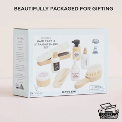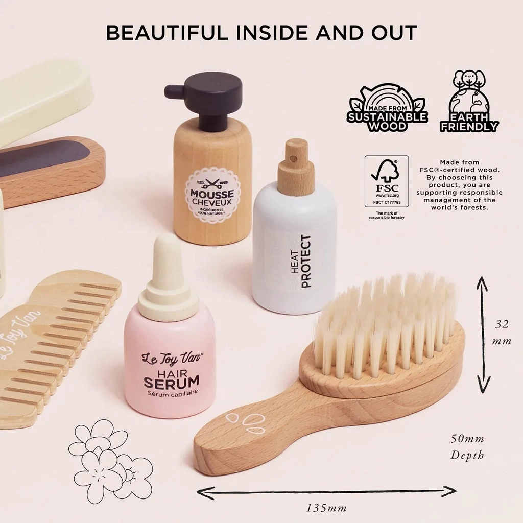 Otroški frizerski set Le Toy Van prinaša ure ustvarjalne zabave za male stilistke in stiliste. Vsebuje 8 kakovostnih lesenih kosov, vključno z likalnikom za lase, krtačo, glavnikom in kozmetičnimi dodatki za domišljijsko nego las. Izdelan je iz FSC certificiranega lesa, ročno dodelan z netoksičnimi, na vodni osnovi barvami in izpolnjuje stroge varnostne standarde. Spodbuja domišljijo, socialne veščine in fino motoriko otrok od 3. leta dalje.