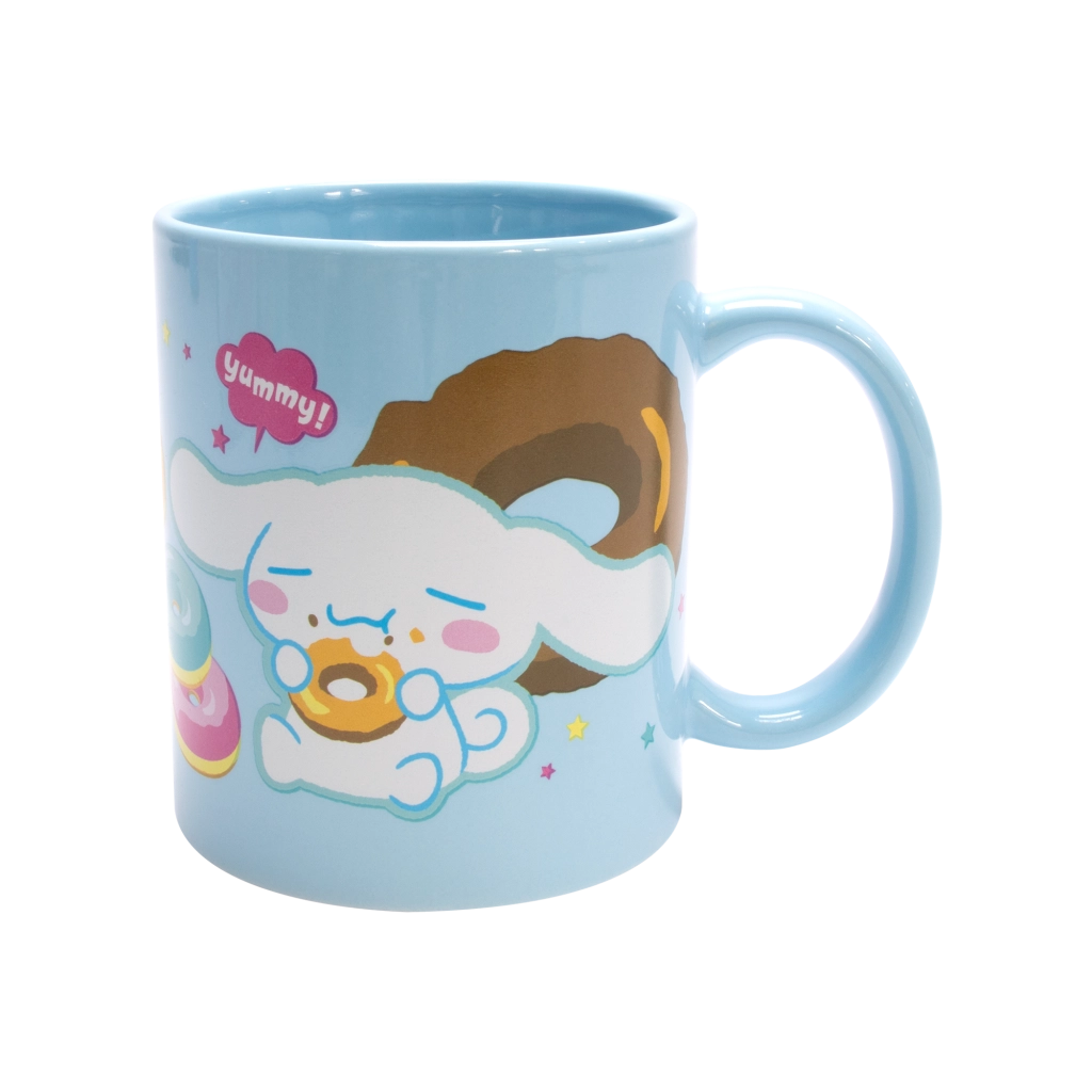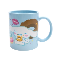 Svetlomodra keramična skodelica s potiskom Cinnamorolla in donutov, idealna za jutranjo kavo ali večerni čaj. Sijajna glazura in udoben ročaj za prijeten oprijem.