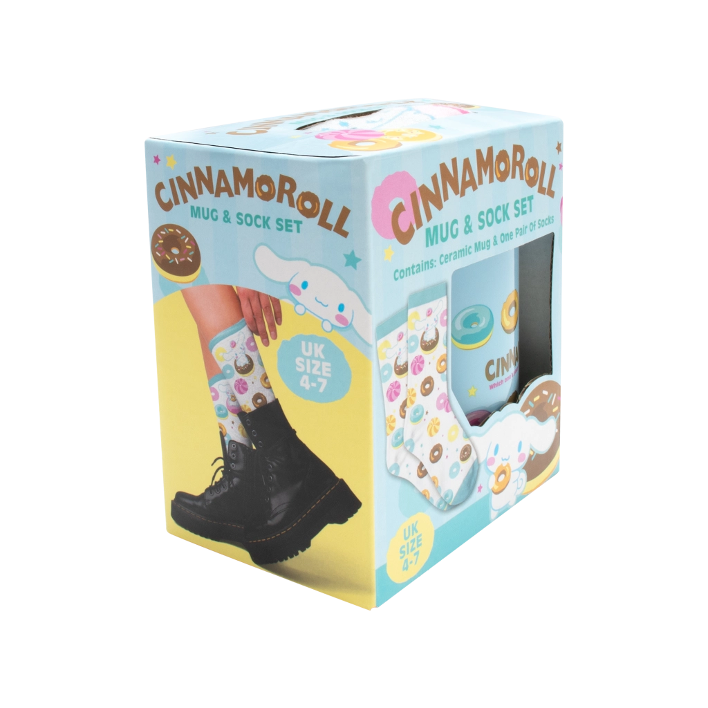 Prisrčen darilni set za ljubitelje Cinnamorolla: svetlomodra keramična skodelica 330 ml in udobne nizke nogavice velikosti 37–40. Slogovno dovršen dizajn z donuti in likom Cinnamoroll, idealno kot darilo za oboževalce in zbiratelje. Skodelica z barvnim potiskom, nogavice iz mehkega in raztegljivega materiala za celodnevno udobje.