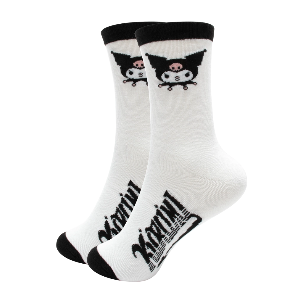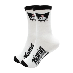Bele nogavice s črnimi robovi in grafiko Kuromi. Zahvaljujoč mešanici poliestra in elastana lepo ohranijo obliko in so prijetne za nošenje.