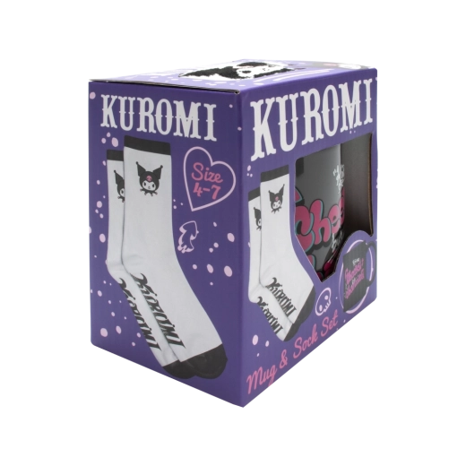 Ta darilni set združuje praktično rabo in igriv dizajn. Keramično skodelico v temno sivi barvi krasi ikonična KUROMI v črnem kostumu z rožnatimi poudarki ter napis »Cheeky but charming« v grafitarskem slogu. Nogavice iz prijetnega pletiva z dodatkom elastana lepo pristajajo in se ujemajo s skodelico – na nartu je grafika Kuromi, na podplatu pa napis »Kuromi«.