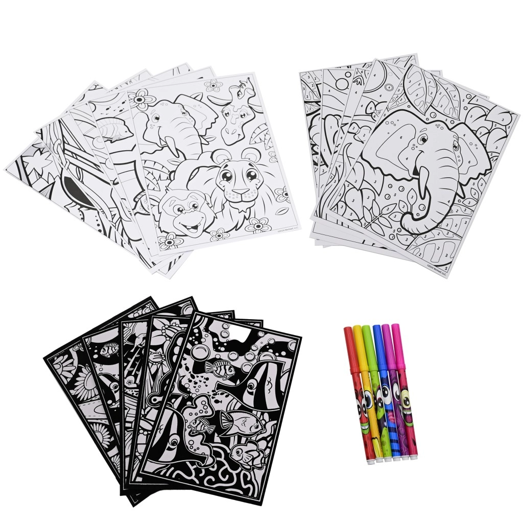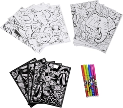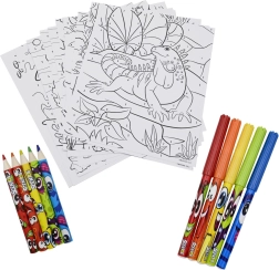Set vključuje pobarvanke z živalmi, dišeče flomastre in barvice – idealno za hitro in barvito barvanje doma ali na poti.
