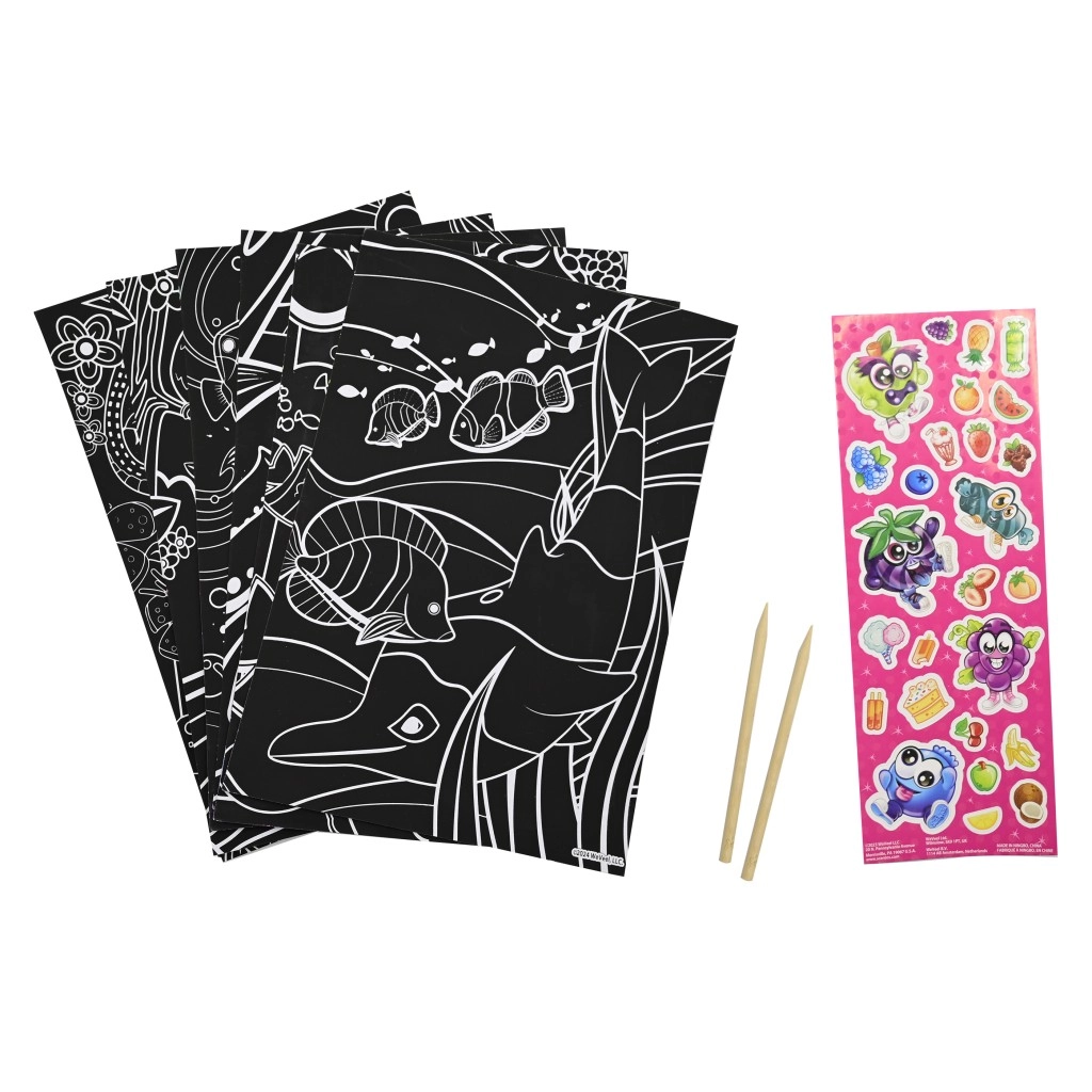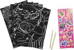 Črne kartice ob praskanju razkrijejo žive barve. Priloženi so leseni pisala in nalepke za dodatno okrasitev.