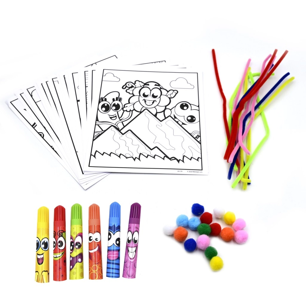 Otroci lahko klasično rišejo s flomastri, barvajo po številkah, odkrivajo barvite motive s praskanjem ali dopolnjujejo slike z nalepkami, cofki in puhastimi žičniki. Vsa pisala so netoksična in varna za otroke od 3 let.