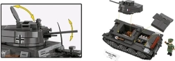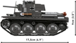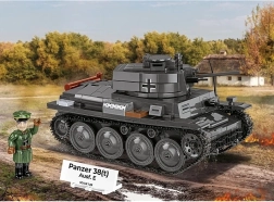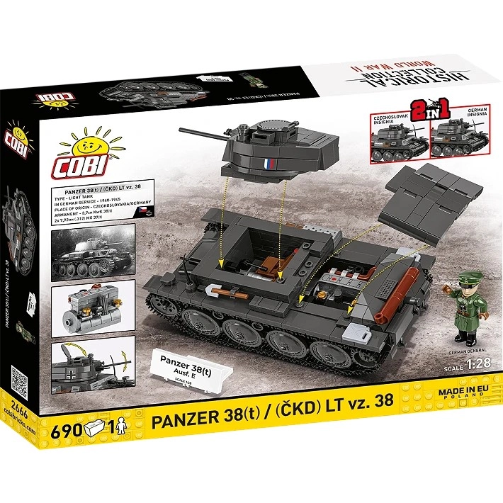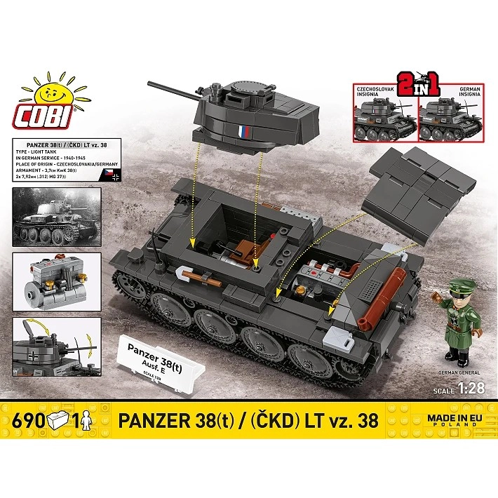 Sestavite ikonični lahki tank v dveh zgodovinskih različicah s kakovostnim kompletom podjetja COBI. Model 2 v 1 omogoča izbiro med češkoslovaškim LT vz. 38 in njegovo nemško različico Panzer 38(t). Uživali boste v merilu 1:28, realističnih gosenicah, odpirajočih se loputah, premičnem topu in trpežnih potiskih. V kompletu sta tudi minifigurica in zbirateljska ploščica.