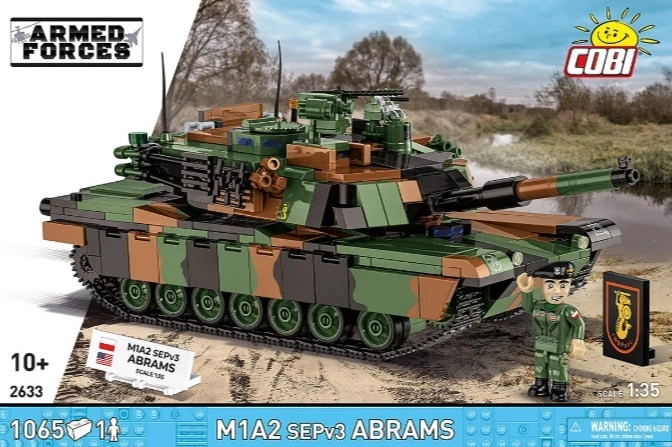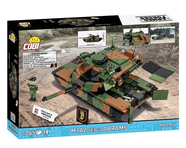 Sestavite ikonični moderni tank M1A2 SEPv3 Abrams v poljskih označbah. Gradbeni set v merilu 1:35 ponuja 1069 kakovostnih kosov, 360° vrtljiv stolp, nastavljivo cev, delujoče gosenice, odpirajoče se lopute in servisne pokrove. Del kompleta je tudi minifigura tankista, zbirateljske tablice in trpežni tiski brez nalepk.