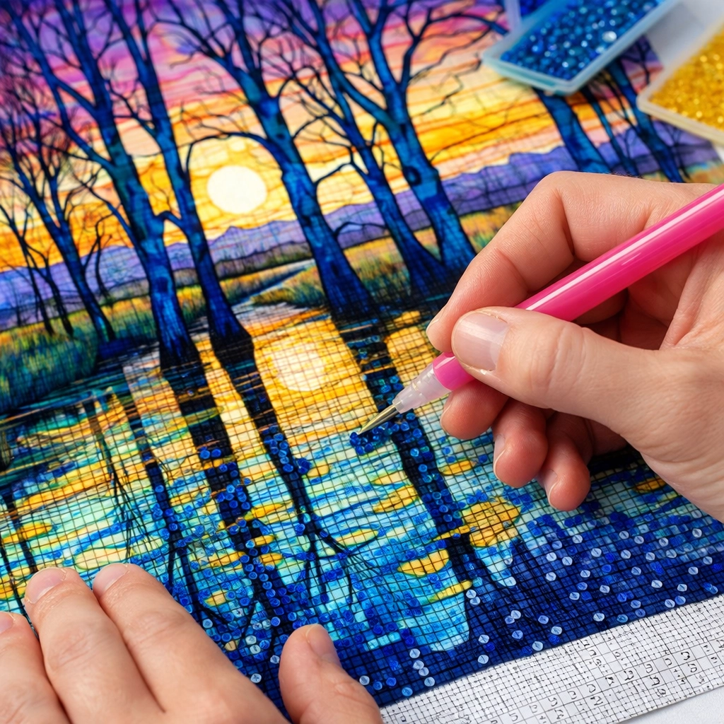 Ustvarite si lasten bleščeč motiv s tehniko diamantnega slikanja. Zahvaljujoč predtiskanemu platnu in pregledni legendi boste kamenčke zlahka nanašali na označena mesta in postopoma sestavili mozaični motiv brez ob jezeru. Ta dejavnost prinaša mir, osredotočenost in veselje do ustvarjanja.