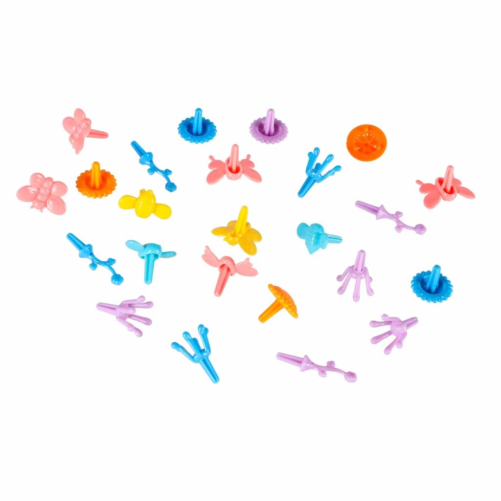 - 1× svetleči avtomobilček s figurico, 13× segment steze, 15× spodnji spojnik, dvižni most in zapornica, skale (2 kosa), nasipi (5 kosov), ograje (5 kosov), zastavice (2 kosa), smerokazi (2 kosa), rože s stebli (84 kosov), drevesca (2 kosa), metuljčki (9 kosov), male živalice (9 kosov), navodila