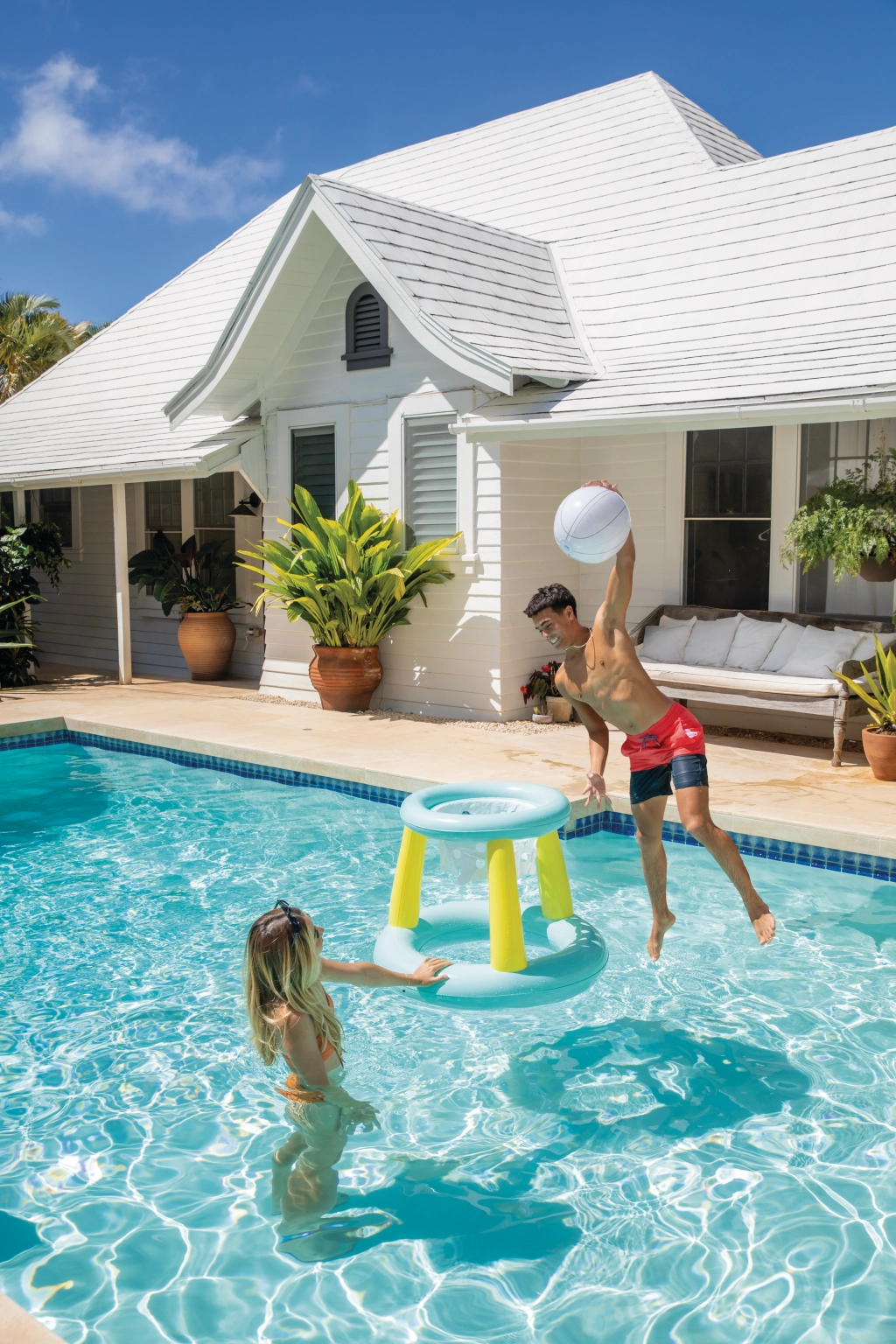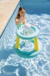 Zahvaljujoč hitremu ventilu koš zlahka napihnete in izpihnete ter ga brez težav prenesete ali shranite. V paketu je napenljiva košarkarska žoga, ki plava in je idealna za metanje ter lovljenje v vodi – popolno za družinska tekmovanja in prijateljske dvoboje.
