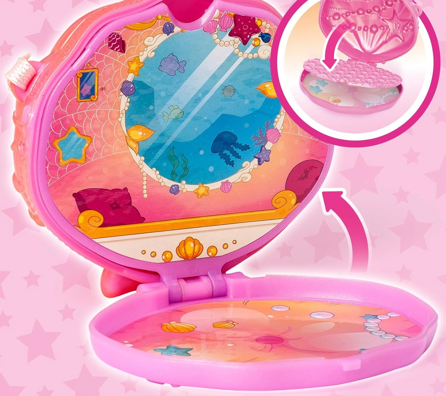 Del seta je torbica v obliki školjke, v katero spravite drobnarije in jo vzamete s seboj kamor koli. Ne manjka edinstvena morska živalica in tematski morski dodatki, ki razvijajo domišljijo in spodbujajo ustvarjanje lastnih zgodb.