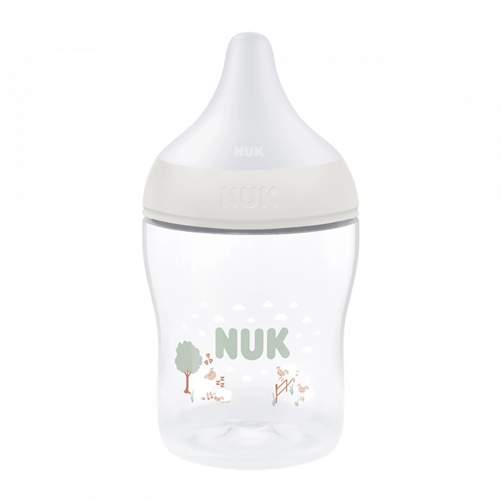 Steklenička NUK Perfect Match je zasnovana tako, da kar najbolj spominja na naravno dojenje. Poseben ortodontski cuclj posnema obliko materine bradavice, nudi dovolj prostora za naravne gibe jezika in čeljusti, široka opora za ustnice pa spominja na stik s kožo. Zahvaljujoč gladko ožajoči se obliki je pitje za dojenčka tekoče, udobno in brez nepotrebnega požiranja zraka.