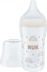 Vgrajeni NUK kontrolni kazalnik temperature spreminja barvo iz modre (hladno) v belo (prevroče), da pomaga preprečiti postrežbo pretirano vroče hrane. Idealna je temperatura okoli 37 °C, ko je kazalnik moder. Steklenička je izdelana iz odpornega, higienskega stekla, je brez BPA in ustreza evropskemu standardu EN 14350.