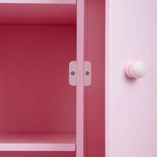 Ta kakovostna lesena omarica v nežni rožnati barvi je idealna za pregledno shranjevanje oblačil in dodatkov vaših punčk. Levi del ponuja dve praktični polici, desna stran je opremljena z obešalno palico za oblekice. Vratca z magnetnim zapiranjem so enostavna za uporabo, izrezi zvezde in lune pa pohištvu dodajo očarljiv videz.