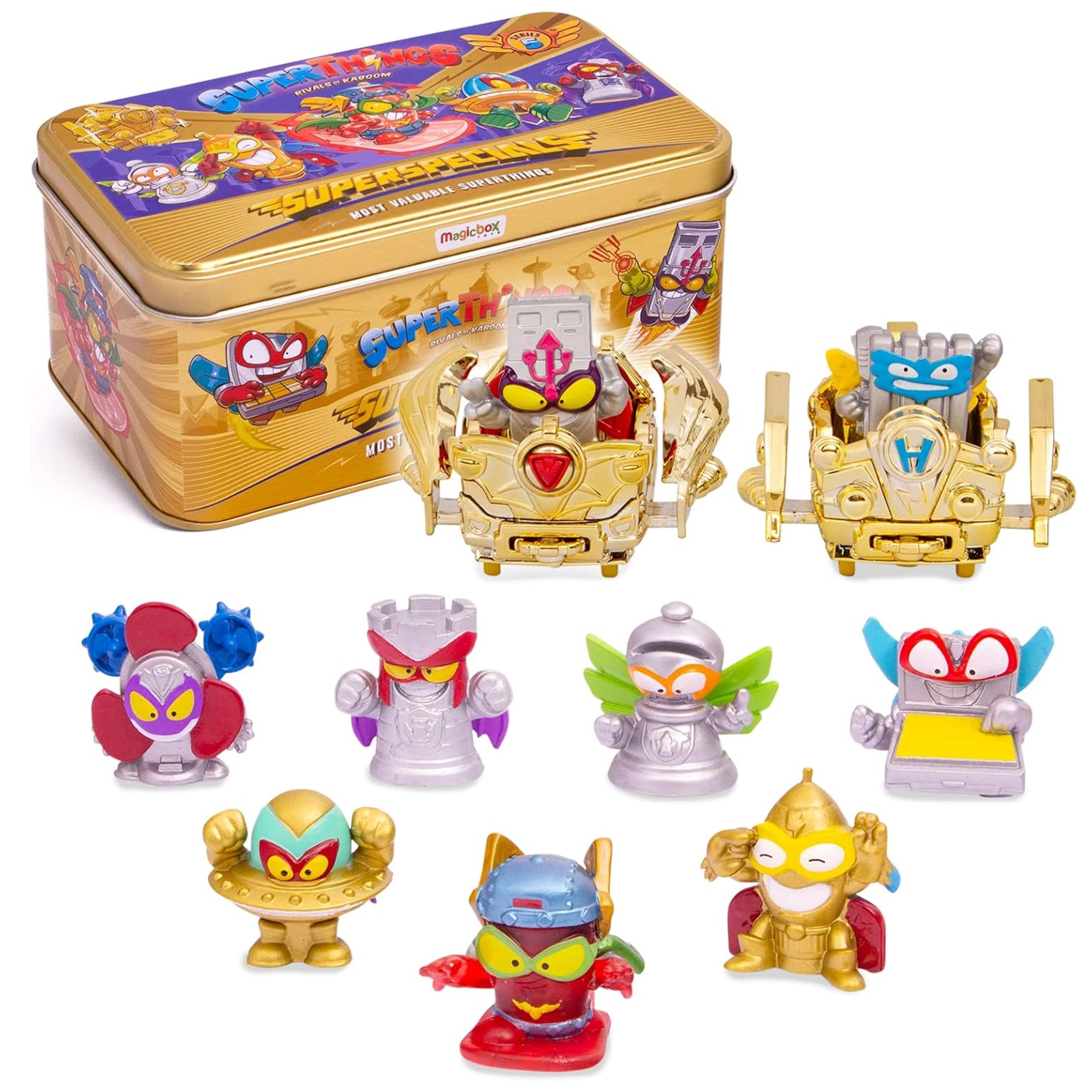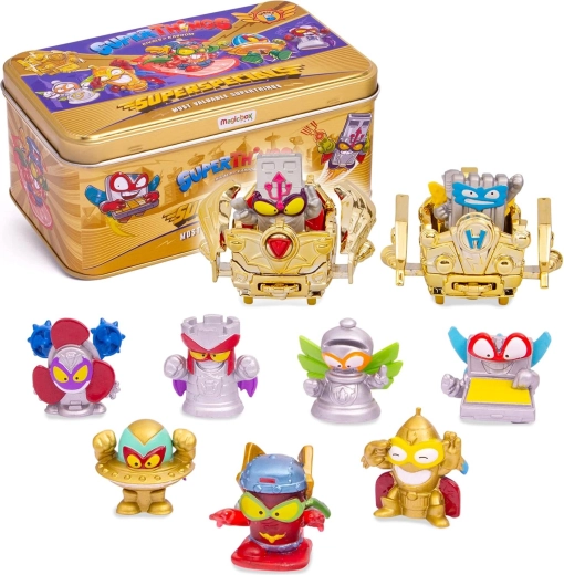 Ekskluzivni set SuperThings Superspecials prinaša razkošno zlato kovinsko pločevinko, v kateri boste varno shranili svoje dragocenosti iz sveta Kaboom City. Vsaka figurica predstavlja oživljen predmet – bodisi pogumnega superjunaka bodisi prebrisanega zlikovca – idealno za igro in širjenje zbirke.