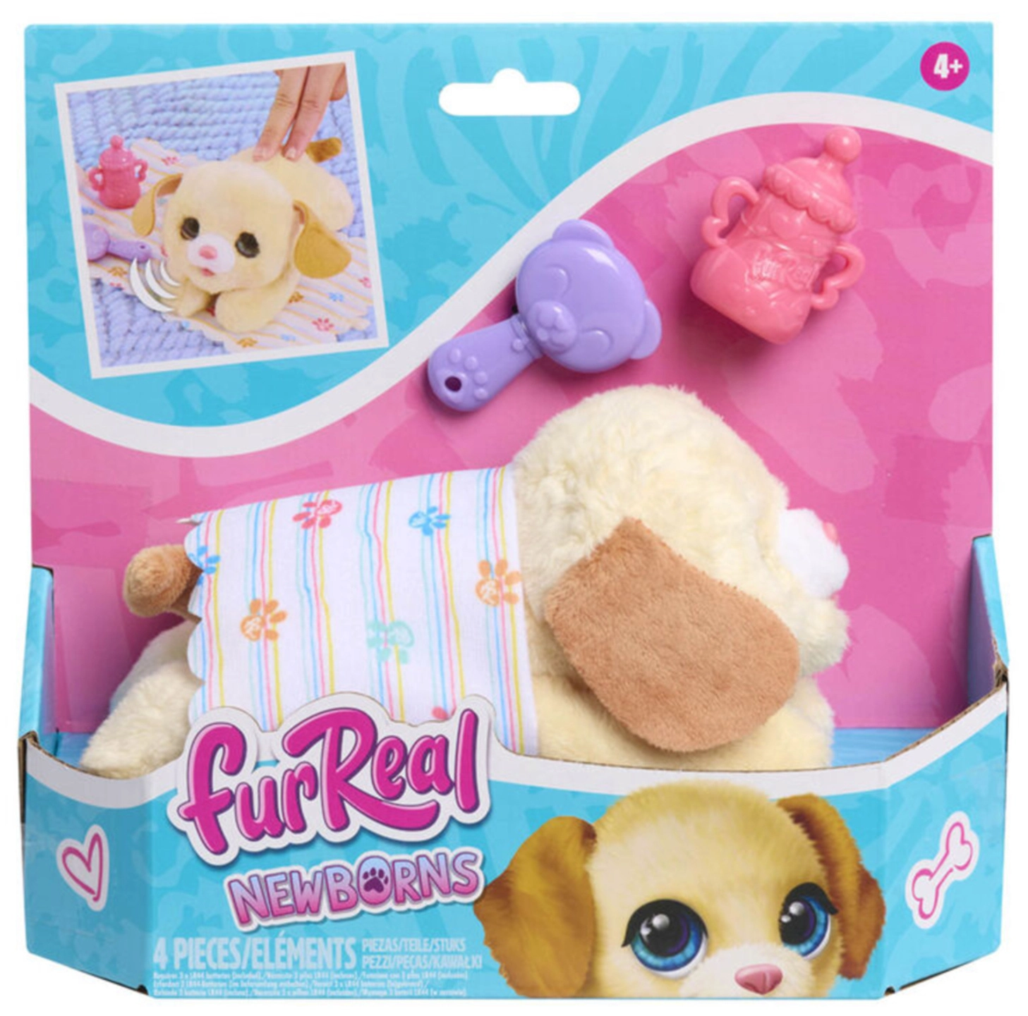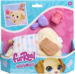 Ljubko interaktivno pasje mladičko FurReal Newborns bodo oboževali vsi otroci, ki imajo radi živalice. Ima mehko plišasto telesce, velike modre oči in rožnat smrček. Na božanje po hrbtu se odziva z veselimi zvoki, po hranjenju s stekleničko ali česanju pa zapira oči in oddaja radostne zvoke. Priloženi so dude, steklenička, krtačka in odejica za še več nege in crkljanja.