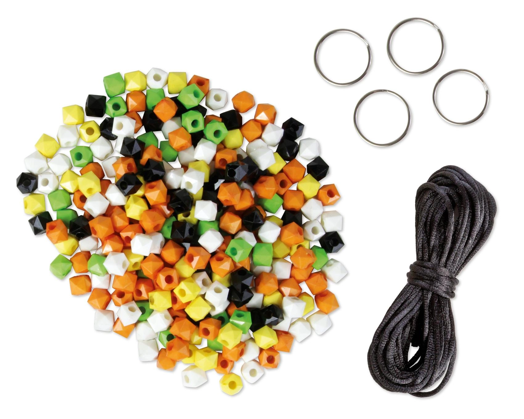 Komplet vsebuje 250 barvnih kroglic, črno vrvico in 4 kovinske obročke – ničesar vam ni treba dokupiti, le začnite.