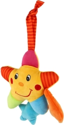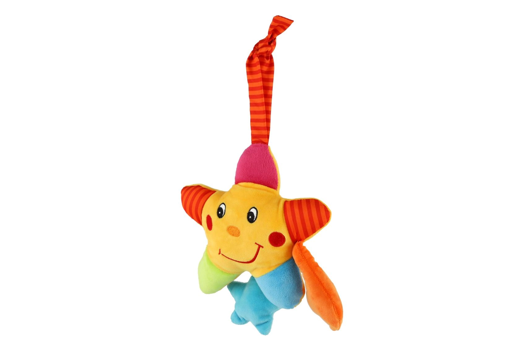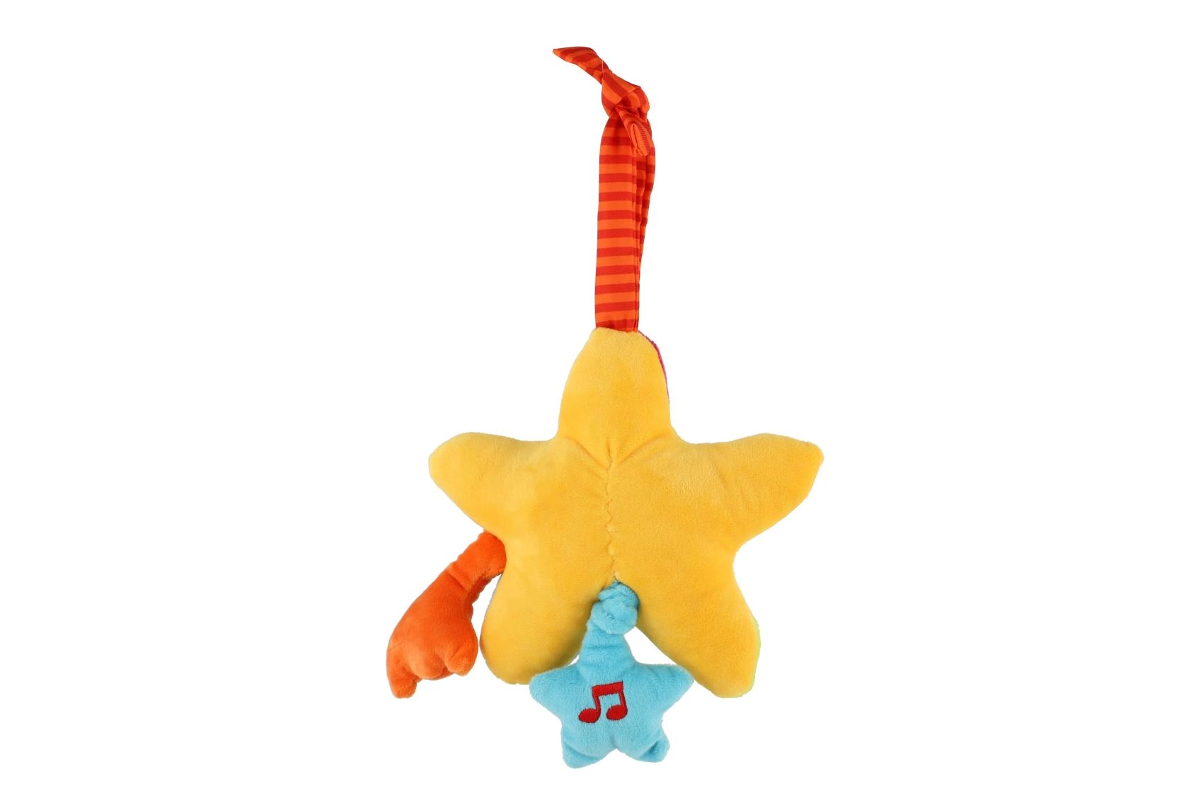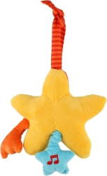 Prisrčna viseča plišasta zvezdica z navijalnim glasbenim mehanizmom razveseli dojenčke od 3 mesecev naprej. Po potegu za vrvico predvaja nežno, pomirjujočo melodijo, ki spodbuja miren spanec in zabavo na poti. Mehak žameten pliš, vesele barve in nasmejan obrazek vabijo k dotikanju in opazovanju. Praktična zanka za obešanje omogoča enostavno pritrditev na posteljico, voziček ali avtosedež.