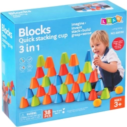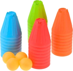 Ta spretnostna in izobraževalna igra ponuja neomejene možnosti gradnje in igre. Otroci lahko iz barvitih trikotnih lončkov ustvarjajo stolpe, piramide in poligone z ovirami, vadijo ravnotežje in natančnost ali pa z žogicami zadevajo izbrane tarče. Protidrseča površina z drobno perforacijo zagotavlja zanesljiv oprijem in stabilnost konstrukcij.